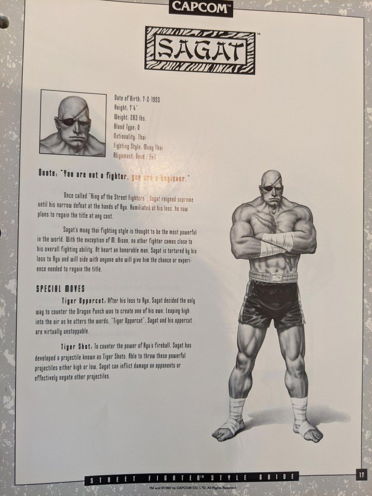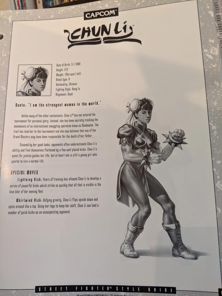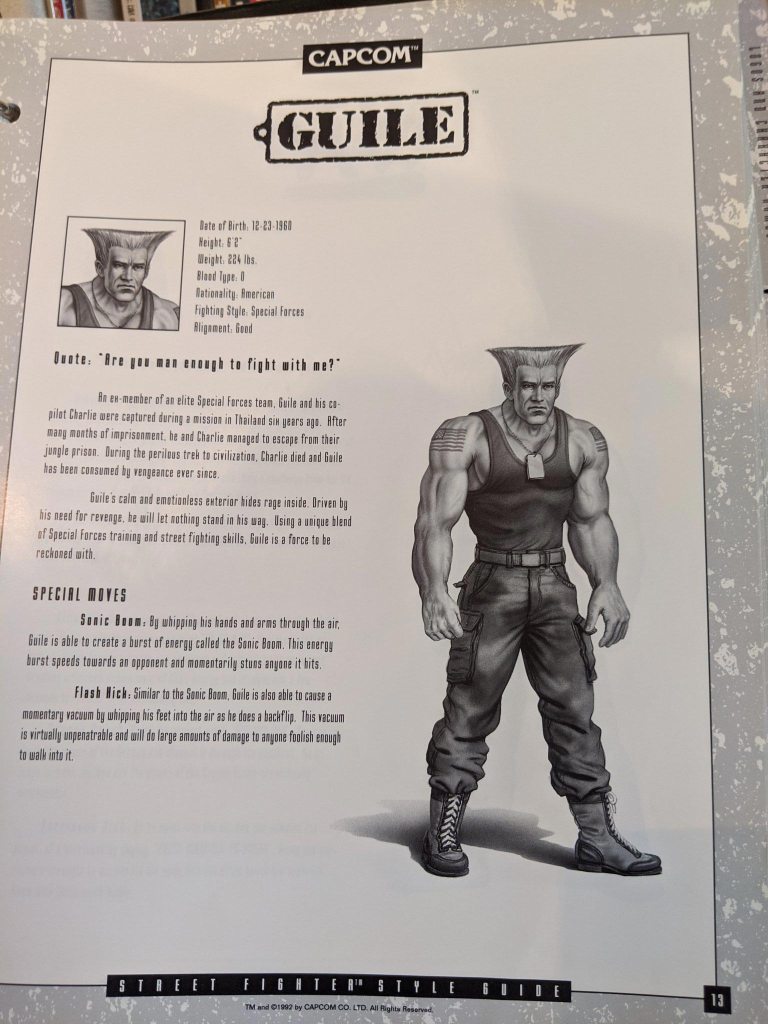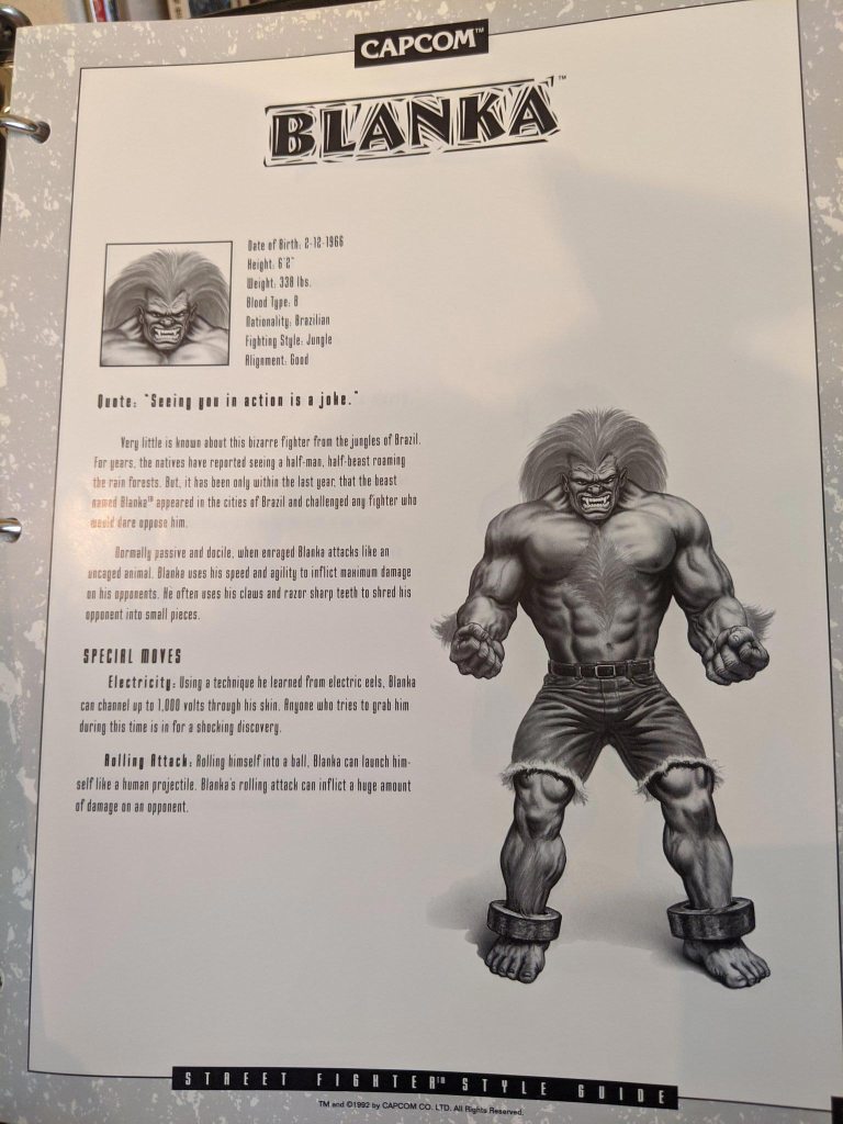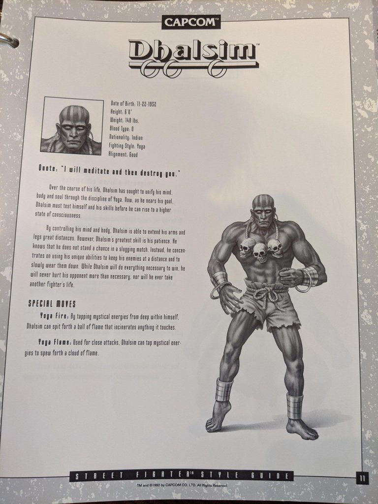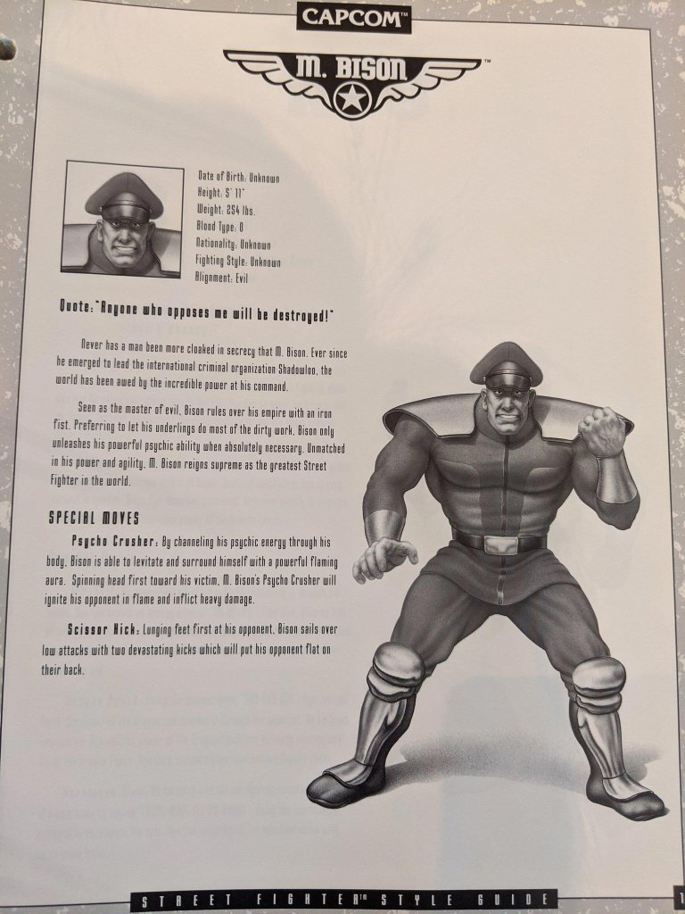 Cada página de personagem também vem com um retrato único, baseado na aparência do jogo, mas tenho certeza que você descobrirá que muitos de seus recursos são bem diferentes do que você provavelmente se lembra – especialmente o rosto de Vega. Alguns desses retratos e biografias aparecem no manual original do SF2 para consoles como o SNES, embora nem todos sejam iguais.