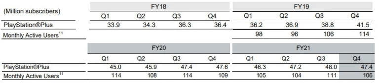 Nos resultados financeiros do ano fiscal de 2021 da empresa publicados na terça-feira, a Sony relatou um total de assinantes PS Plus de 47,4 milhões em março de 2022, uma queda de 0,6 milhão em relação ao trimestre anterior (dezembro de 2021) e de 0,2 milhão em relação ao ano anterior.