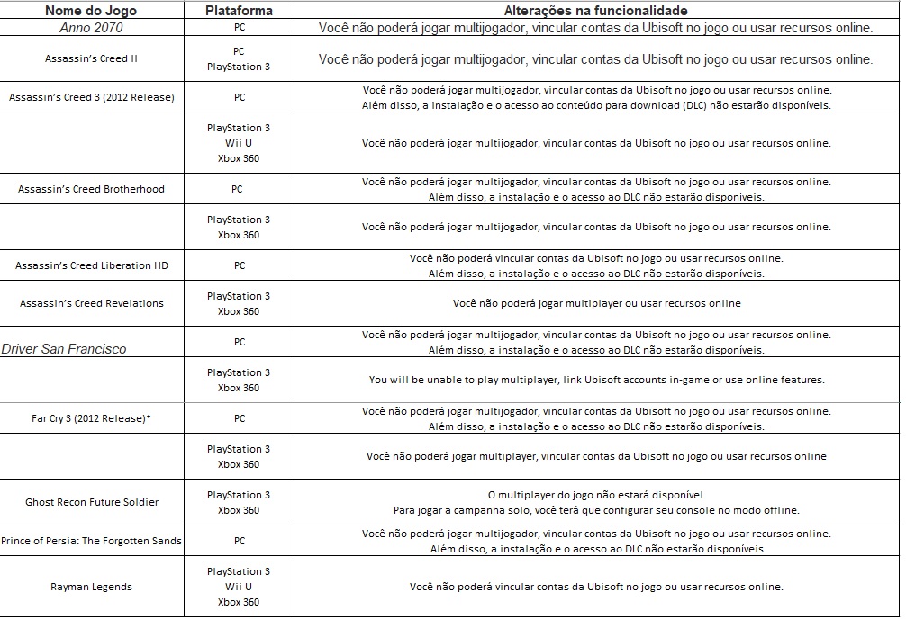A lista completa de jogos a serem colocados offline, de acordo com a Ubisoft, é a seguinte: