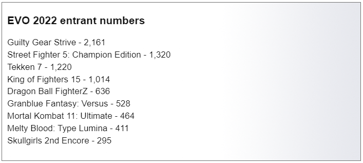 Os organizadores do Evo 2022 já divulgaram os números finais de inscrição para o evento do próximo mês, onde houve algumas mudanças desde a última vez que ouvimos sobre os números.