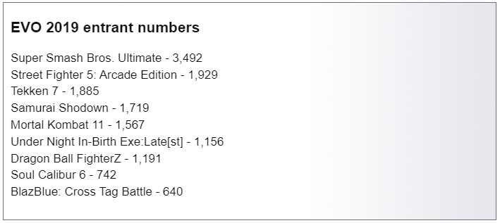 Com 7.445 participantes inscritos, um pouco menor do que os números do Evo 2019, que atingiram 9.230 participantes, mas o torneio também está perdendo o maior jogo daquele ano, Super Smash Bros. Ultimate, que teve 3.534 competidores.