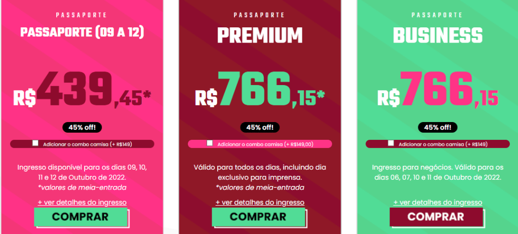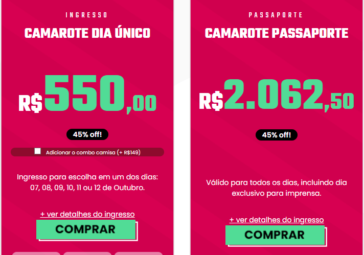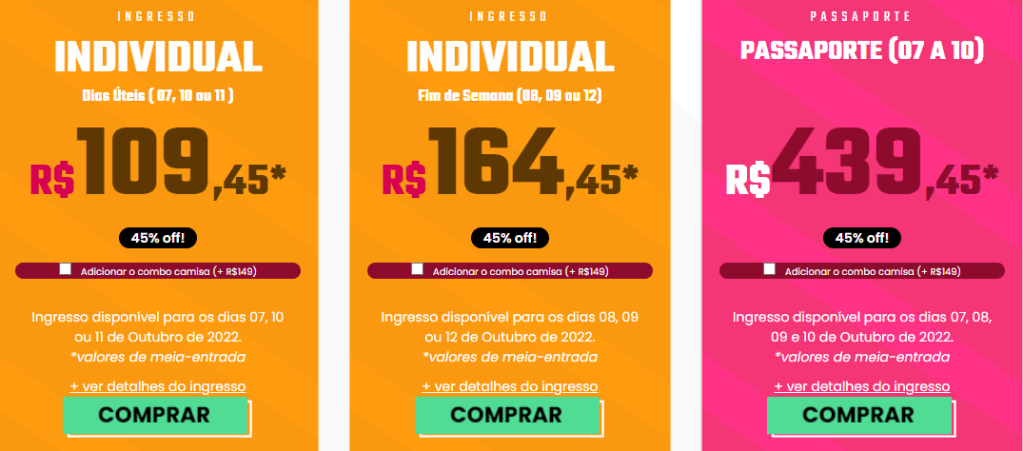Então se você ainda não adquiriu o seu ingresso é hora de compra-lo antes que vire o lote. Veja abaixo os valores dos ingressos que estão com o desconte de 45%.