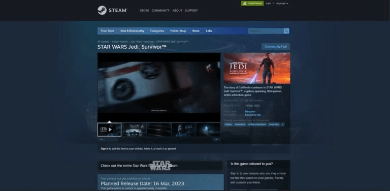 A página do Steam, que listou as datas de lançamento de 15 e 16 de março, dependendo de quando foi visualizada na segunda-feira, também inclui novos detalhes da história de Star Wars Jedi: Survivor, além de informações sobre bônus de pré-venda e uma edição de luxo do jogo.