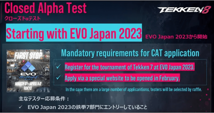 Para este primeiro teste, os jogadores em potencial precisarão se inscrever na chave de Tekken 7 na Evo Japan, que começa em 31 de março, e também se registrar em um site especial que será lançado posteriormente.