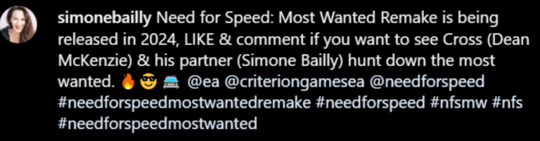 Vale a pena notar que Bailly provavelmente está se referindo ao Need for Speed: Most Wanted de 2005 (no qual ela apareceu), não à versão lançada em 2012.