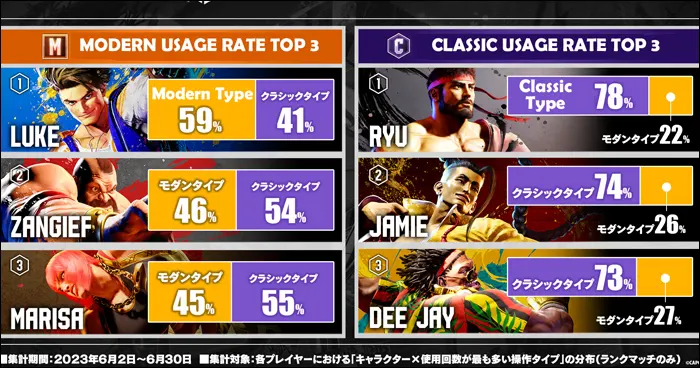Para algumas classificações extras, a Capcom também compartilhou os três principais personagens do Japão para os tipos de controle Clássico e Moderno em partidas classificadas em junho.