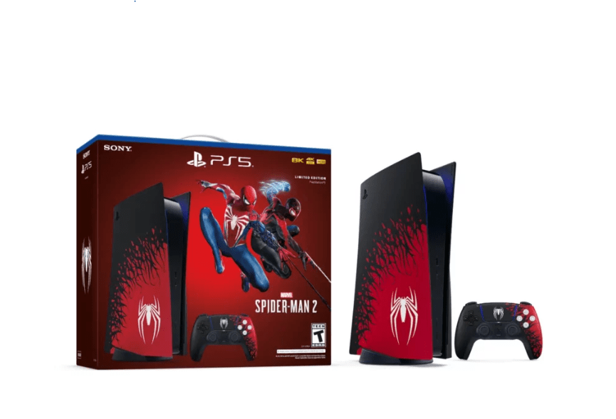 O Marvel’s Spider-Man 2 Limited Edition PS5 Bundle apresenta um design de capa de console PS5 personalizado e controlador sem fio DualSense correspondente.