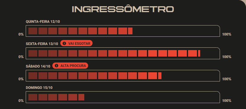 Lembrando também que os ingressos podem esgotar dependendo do dia. Então deem uma olhada nesse ingressômetro para ver como esta a venda de ingressos. No site da BGS esta sendo atualizado periodicamente.
