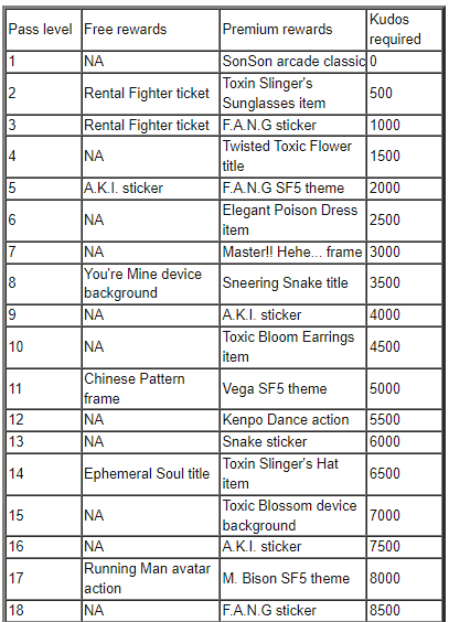 Os compradores de passes premium recebem algo para cada nível, apresentando o clássico de arcade da Capcom, SonSon, imediatamente, juntamente com vários outros itens mencionados acima, além de temas de personagens de Street Fighter 5 para F.A.N.G, M. Bison e Vega.