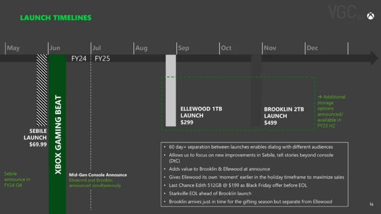 De acordo com outro slide, ‘Brooklin’ será lançado em novembro de 2024 com 2 TB de armazenamento pelo mesmo preço do atual Xbox Series X (US$ 499).