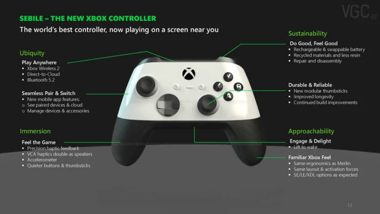 O novo controle do Xbox, codinome ‘Sebile’, incluirá novos recursos de feedback tátil e acelerômetro, de acordo com os documentos vazados, botões modulares e uma bateria recarregável e trocável.
