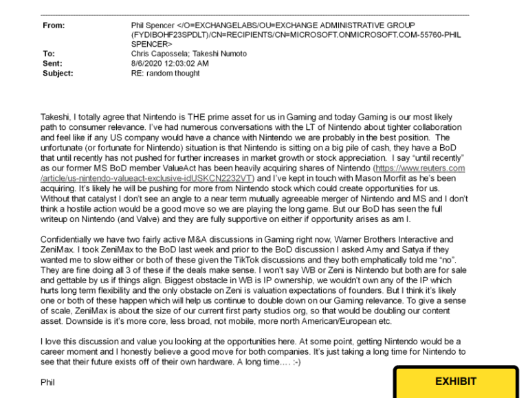 Em documentos judiciais não editados publicados durante a noite – aparentemente por engano – Spencer discute a potencial aquisição da Nintendo em uma conversa por e-mail com o vice-presidente executivo e diretor comercial da Microsoft, Takeshi Numoto.