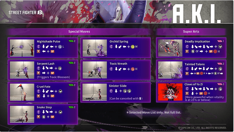 Você pode encontrar a lista de movimentos de A.K.I. abaixo, antes de seu lançamento em 27 de setembro de 2023.