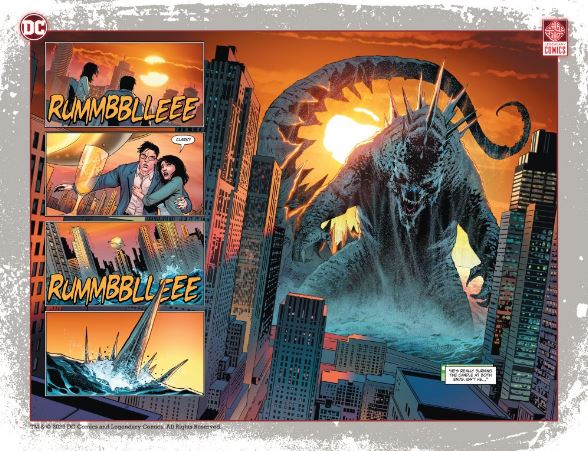 Buccellato acrescenta: “Na prévia, Superman está ocupado tentando realizar o máximo possível de trabalho de super-herói antes de tirar suas primeiras férias… esperançosamente para comemorar seu noivado com Lois Lane. Mas sua busca pessoal íntima é perturbada pela chegada dos monstros Legendary Monsterverse… e ele deve enfrentar a maior ameaça (trocadilho intencional) que já enfrentou. O Rei dos Monstros. Godzilla.”
