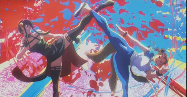 As coisas começam com Yor Forger em seu vestido preto enfrentando Chun-Li no palco Nayshall do SF6 com a mesma perspectiva 2D do jogo de luta antes de trocar golpes em uma sequência chamativa.