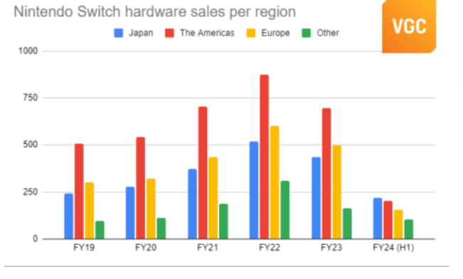 Apesar do desempenho invulgarmente forte para uma consola que entra no seu sétimo ano no mercado, as vendas de hardware Switch estão claramente em declínio, especialmente nos principais mercados fora do Japão.