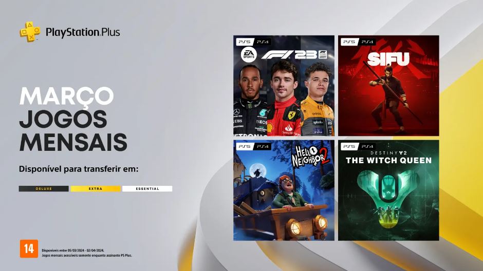 Os títulos do PlayStation Plus do próximo mês serão EA Sports F1 23 (PS5, PS4) Sifu (PS5, PS4), Hello Neighbour 2 (PS5, PS4) e Destiny 2: The Witch Queen (PS4, PS5).