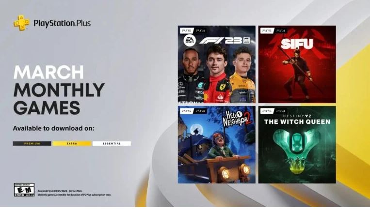 Os jogos PlayStation Plus Essential de março são EA Sports F1 23 (PS5, PS4), Sifu (PS5, PS4), Hello Neighbour 2 (PS5, PS4) e Destiny 2: The Witch Queen (PS4, PS5).