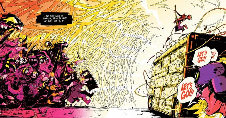 Após pequenas batalhas com Carnage e o Sinister Six-Piece, Spider-Punk se concentrou em reconstruir sua comunidade com o apoio de Wakanda em SPIDER-PUNK: ARMS RACE (2024) #1. Enquanto o Spider-Band está ocupado lidando com ameaças de rua como Vulture e Lizard, Dok Ock e Justin Hammer estão desenvolvendo Sentinel-Slayers robóticos para eliminá-los. Na verdade, apesar de todos os seus poderes e habilidades, o Spider-Band mal conseguiu derrotar uma dessas máquinas gigantes com tentáculos. Enquanto aquele Sentinel-Slayer experimental quase destruiu a vizinhança do Spider-Punk, Dok Ock já está desenvolvendo projetos ainda mais fortes para levar o Spider-Punk e seus aliados ao limite.