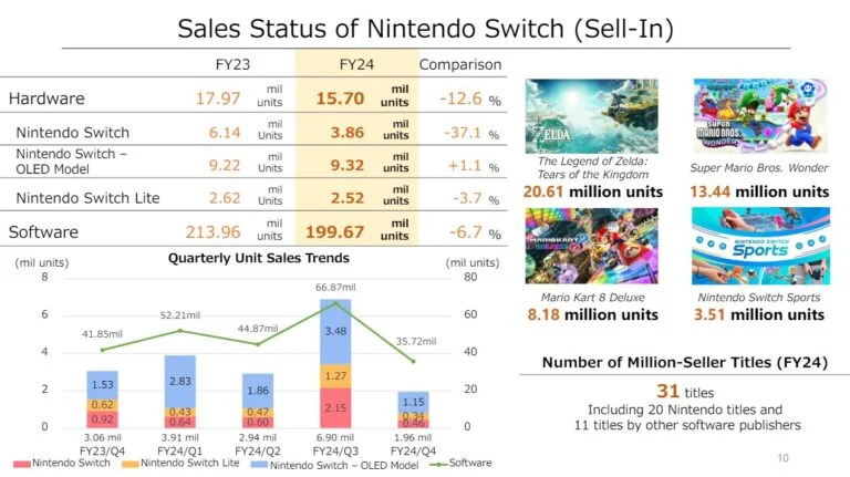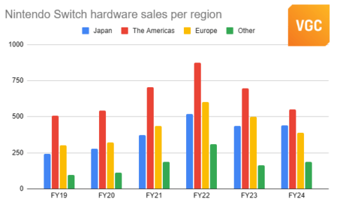 No ano fiscal de 24, a venda de consoles Switch caiu 12,6% ano a ano. 28% dessas vendas de hardware ocorreram no Japão, atrás da América do Norte (35,15%), mas à frente da Europa (24,8%).