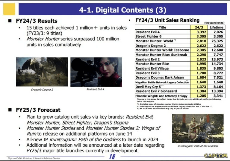 O último grande título da Capcom, o aclamado RPG Dragon’s Dogma 2, vendeu 2,6 milhões de unidades desde o lançamento, elevando as vendas gerais da franquia Dragon’s Dogma para mais de 11 milhões. Dragon’s Dogma 2 foi notável como o primeiro título de US$ 70 da Capcom.