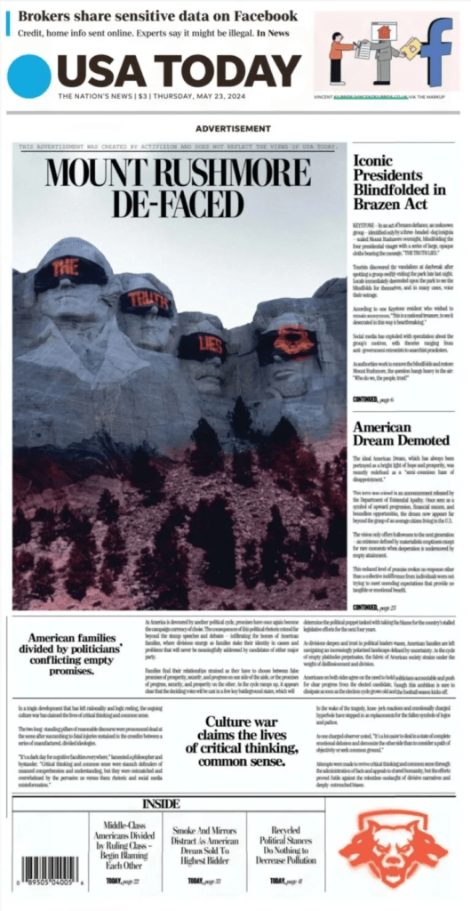 Tendo lançado um teaser do jogo no início desta semana, a Activision intensificou sua campanha de marketing com anúncios na edição de quinta-feira do USA Today, que podem ser vistos acima e abaixo.