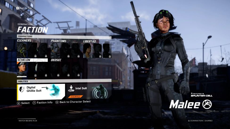Existem atualmente cinco facções no jogo: The Cleaners de The Division, Libertad de Far Cry, Echelon de Splinter Cell, DeadSec de Watch Dogs e Phantoms de Ghost Recon Phantoms (nós também não). Cada uma das facções vem com habilidades de classe, bem como um ultimate.