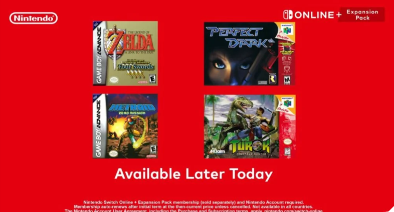 The Legend of Zelda: A Link to the Past Four Swords, Metroid Zero Mission, Turok: Dinosaur Hunter e Perfect Dark serão adicionados ao serviço ainda hoje.