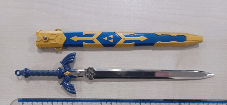 Quando Bray se aproximou dos oficiais, eles viram que ele segurava uma réplica em miniatura da Master Sword dos jogos Legend of Zelda.