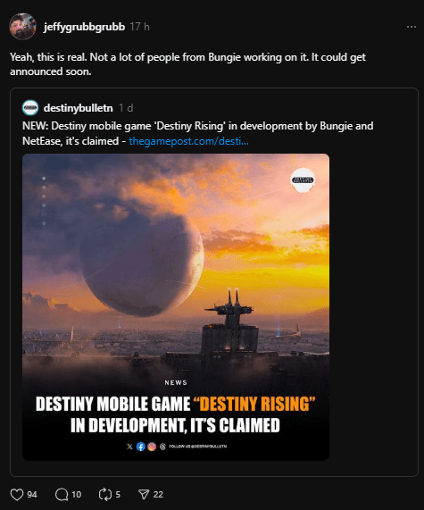 Jeff Grubb, do Giant Bomb, respondeu à postagem do Destiny Bulletin no Threads, dizendo que o jogo realmente existe e que mais informações podem estar a caminho.
