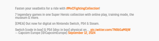 Um tweet postado na conta oficial da Capcom Europe no X na semana passada afirmou que a versão Switch é um código em uma caixa, enquanto a versão PlayStation 4 terá um disco.