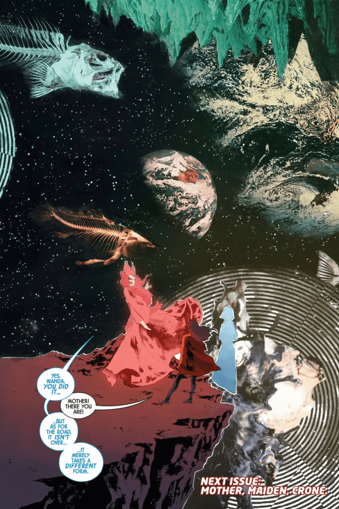 A pedido do espírito de Natalya, o fantasma de Wanda e Agatha jurou curar a magia caminhando mais pela Estrada das Bruxas do que qualquer um já havia feito em SCARLET WITCH (2015) #12 de James Robinson e Annapaola Martello. Wanda e Agatha caminharam pelo reino por semanas e encontraram cada vez mais sinais de danos e decadência de qualquer coisa que estivesse prejudicando a magia. Embora a recente autorreflexão e os encontros de Wanda com outros místicos a tenham preparado para essas batalhas, seu uso contínuo de magia envelheceu rapidamente seu espírito, como visto em SCARLET WITCH (2015) #13, de James Robinson e Jonathan Marks.
