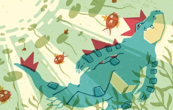 “Feraligatr normalmente é um Pokémon muito feroz, mas eu queria retratar um momento de calma, como se Feraligatr estivesse nadando pela manhã e observando o sol surgir na água.