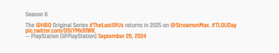 A segunda temporada de The Last of Us será lançada em 2025. Outras novas adições ao elenco incluem Kaitlyn Dever como Abby, Young Mazino como Jessie, Danny Ramirez como Manny, Tati Gabrielle como Nora, Ariela Barer como Mel e Spencer Lord como Owen. .