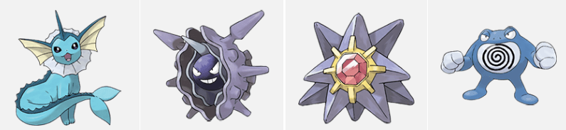 Vaporeon, Cloyster, Starmie e Poliwrath