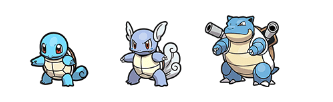 - Squirtle–>Lv. 16–>Wartortle–>Lv. 36–>Blastoise