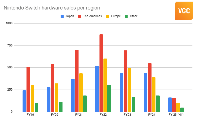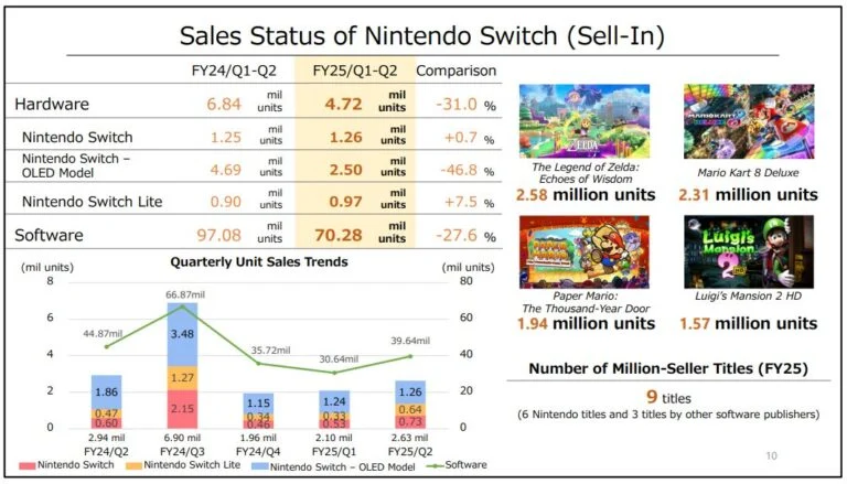 Em software (abrangendo abril a setembro), Paper Mario The Thousand-Year Door, lançado em maio, vendeu 1,94 milhão de unidades, enquanto Luigi’s Mansion 2 HD, lançado em junho, vendeu 1,57 milhão de unidades. The Legend of Zelda: Echoes of Wisdom, lançado no final de setembro, vendeu 2,58 milhões de unidades nos primeiros dias.
