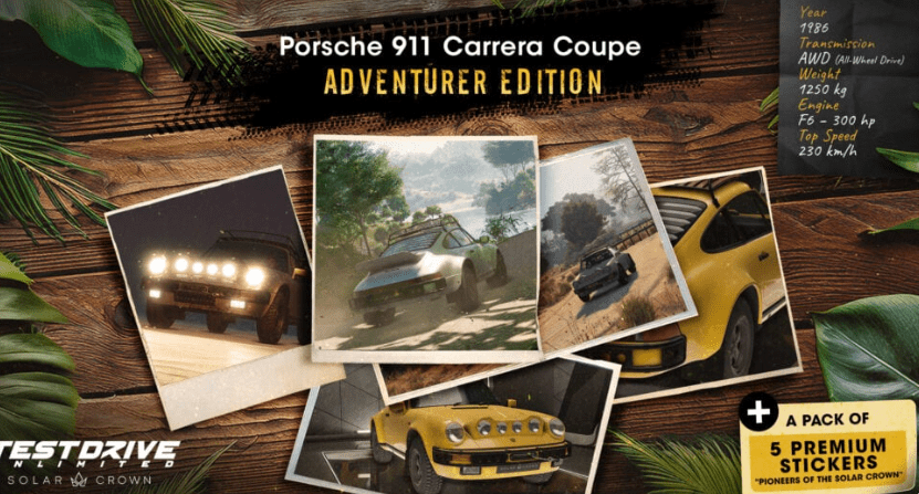 Isso inclui uma edição off-road ‘Adventurer’ do Porsche 911 Carrera Coupe 1986 e um pacote de cinco adesivos para personalizar seus carros.