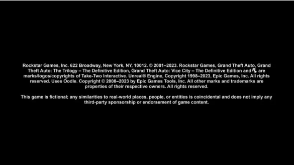 No entanto, depois de baixar o patch, nos deparamos com uma tela diferente, mostrando um fundo preto e informações revisadas de direitos autorais relacionadas apenas à Rockstar e à Epic Games.