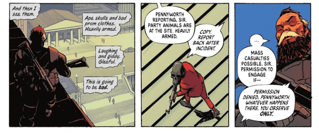 Na edição #2, fica claro que Alfred está rapidamente desenvolvendo uma afeição por Bruce/Batman, em parte porque sua guerra contra os Party Animals está tornando a missão de coleta de informações de Alfred muito mais fácil. Alfred traça a campanha do Batman pela cidade. Ele observa que, embora a maioria dos soldados em campo siga uma de duas táticas, AF (avançar para frente) e RR (recuar e reagrupar), Batman nunca parece disposto a recuar ou ceder terreno. Ele é simplesmente Batman AF.