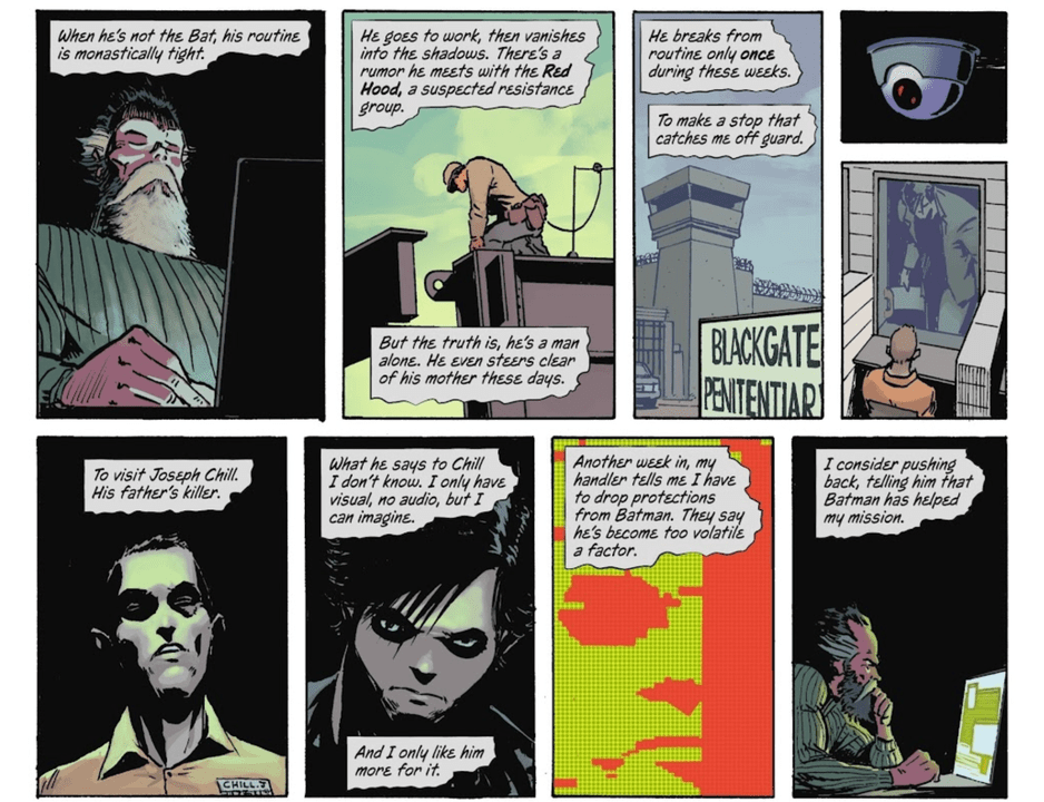 A edição nº 2 mostra mais desse grupo de amigos, à medida que Bruce, cada vez mais recluso, faz uma rara visita ao seu jogo regular de pôquer. A brincadeira deles revela que Eddie é tão fascinado por enigmas e jogos de palavras quanto o Charada normal, enquanto dá a entender que Oswald já tem os dedos em algumas tortas menos saborosas. Harvey, por sua vez, revela-se um humilde funcionário jurídico com grandes ambições profissionais. A única amiga MIA deste jogo é Selina, que estaria viajando pelo mundo e recentemente fez uma parada no Cairo.