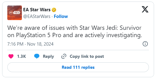 A EA disse que está trabalhando em um problema que tem visto relatos de que a versão PS5 Pro de Star Wars Jedi: Survivor parece pior no PS5 Pro do que no PS5.