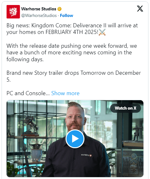 A data de lançamento de Kingdom Come Deliverance 2 foi antecipada em uma semana.