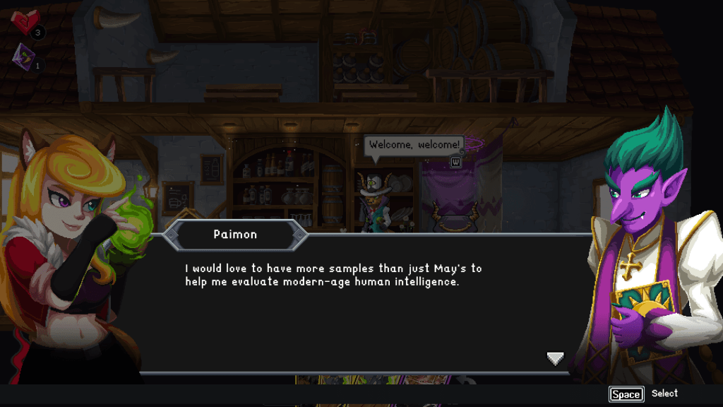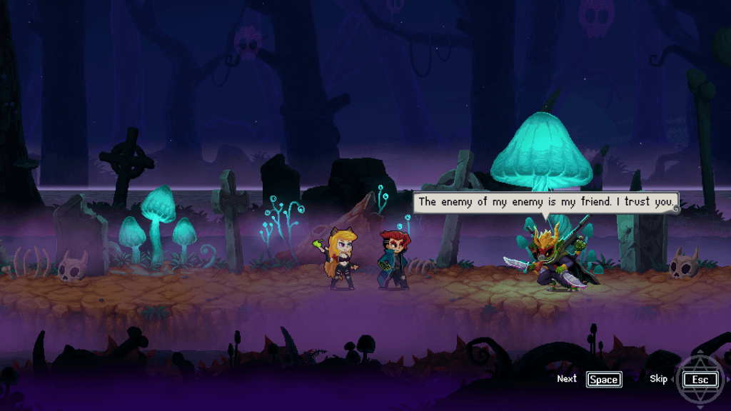 A história de Spirit Mancer também sofre de diálogos pouco inspirados e ritmos de cenas desajeitados. As conversas se arrastam, com caixas de texto que permanecem por muito tempo antes de avançar automaticamente a conversa. Pior ainda, o botão “próximo” pula não apenas o texto, mas também as animações, deixando as cenas abruptas e sem polimento. É uma pena, já que o jogo apresenta um design de mundo colorido e vibrante, com design de personagens verdadeiramente único, se não às vezes desconcertante.