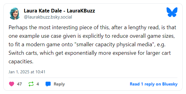 Conforme observado pela jornalista Laura Kate Dale, a nova patente menciona o uso de tecnologia de upscaling para reduzir o tamanho geral dos jogos para caber um jogo moderno em “mídia física de menor capacidade”, por exemplo, cartões de jogo.