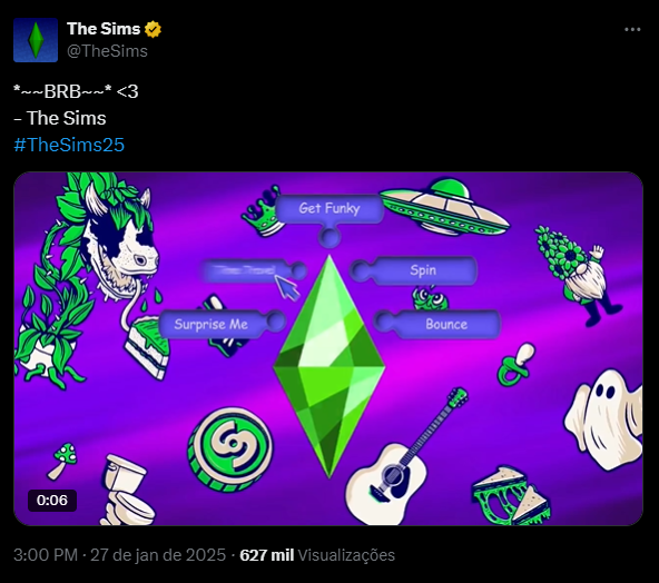 Na segunda-feira, a conta também postou uma mensagem dizendo “BRB” acompanhada de uma animação mostrando o menu de ação do The Sims 2, seguido pelo fundo quadrado colorido da arte da caixa do The Sims.