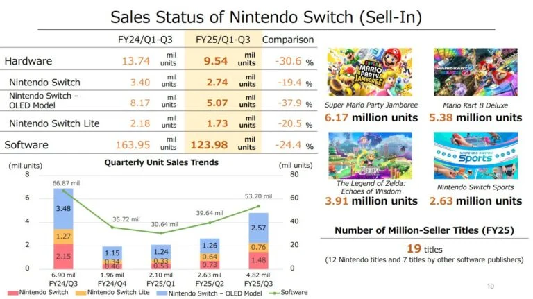Em software (cobrindo outubro a dezembro), Legend of Zelda: Echoes of Wisdom (lançado em setembro) registrou mais 1,3 milhão de vendas, totalizando 3,91 milhões. Super Mario Party Jamboree (lançado em outubro) vendeu 6,17 milhões de unidades – o melhor da série nas primeiras 11 semanas – e Mario & Luigi Brothership (lançado em novembro) vendeu 1,4 milhão de cópias.