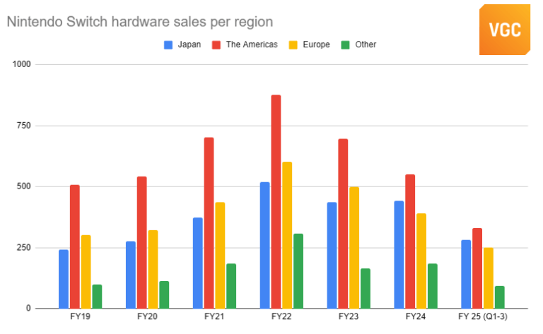 Ano a ano, as vendas de hardware Switch caíram mais de 30% e as vendas de software caíram 24%, o que a Nintendo atribui em parte ao impulso fornecido por The Legend of Zelda: Tears of the Kingdom (lançado em maio de 2023) e Super Mario Bros. Wonder (lançado em outubro de 2023) em seu ano fiscal anterior.