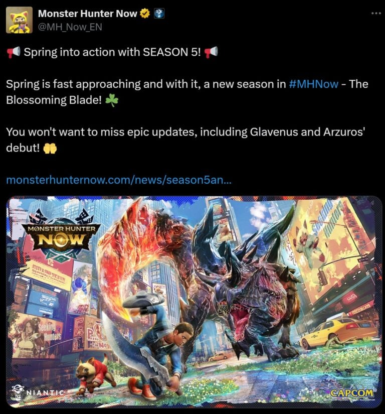 Seguindo a colaboração de Monster Hunter Wilds, Monster Hunter Now começará a lançar sua próxima temporada completa. The Blossoming Blade, que deve começar em 6 de março, apresentará vários monstros clássicos. O Glavenus, visto pela primeira vez em Monster Hunter Generation é a manchete da nova temporada, ao lado dos Arzuors, que fez sua estreia em Monster Hunter Portable 3rd.