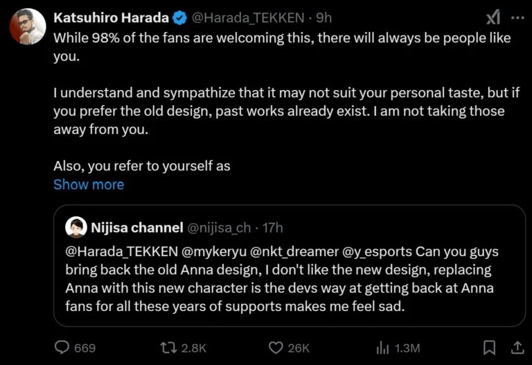 O diretor da série Tekken, Katsuhiro Harada, criticou um fã, e “pessoas como eles”, por reclamar do retorno da aparência atualizada de um personagem.